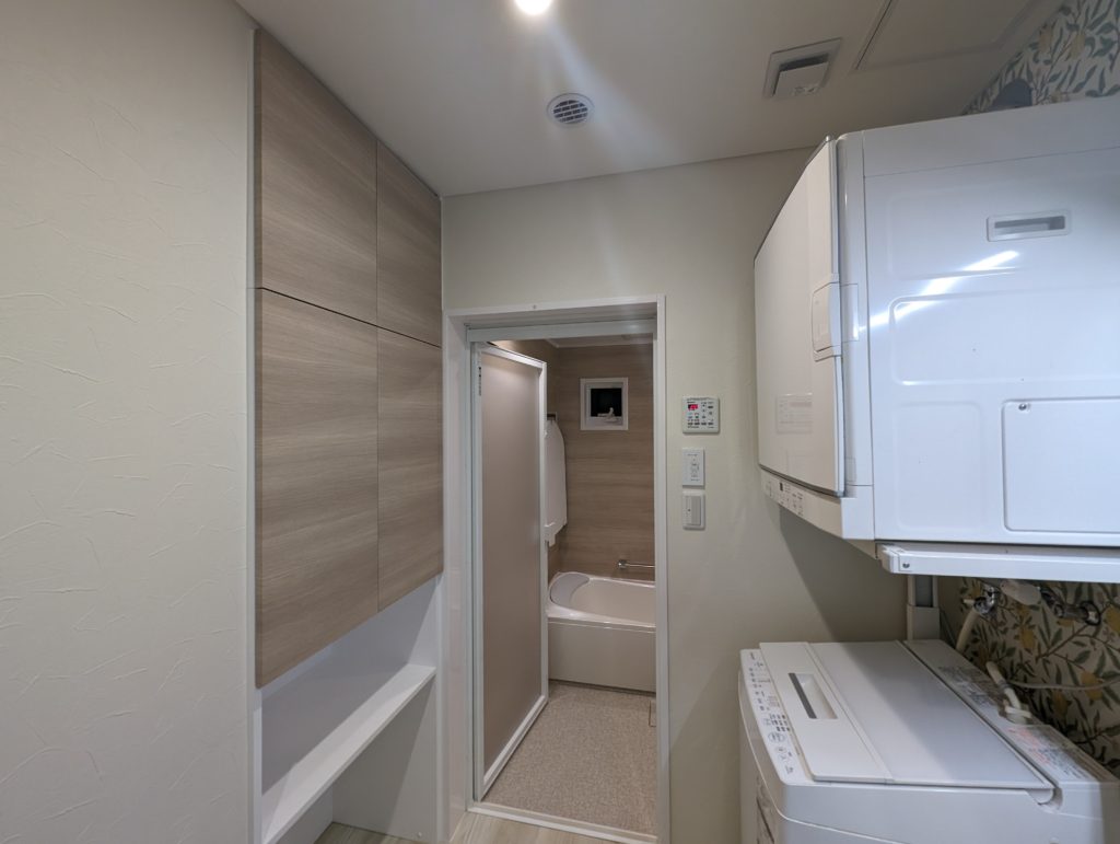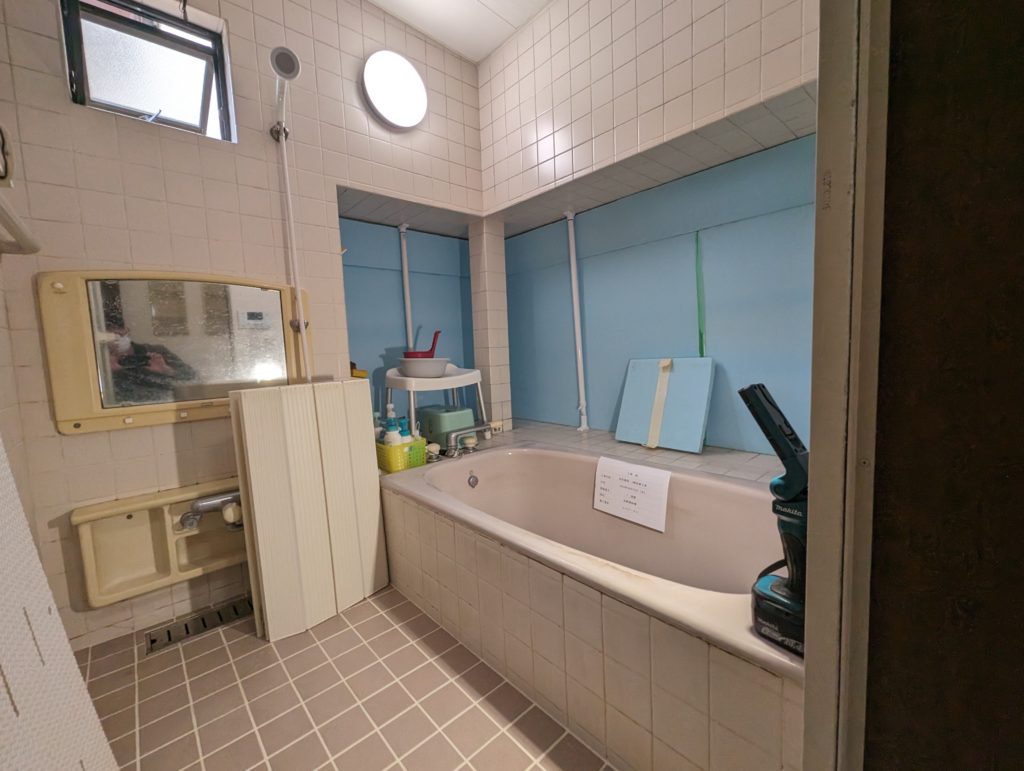 施工後 窓を塞ぎ断熱材入りのユニットバス、浴室暖房乾燥機は洗面所にもダクトで伸びています