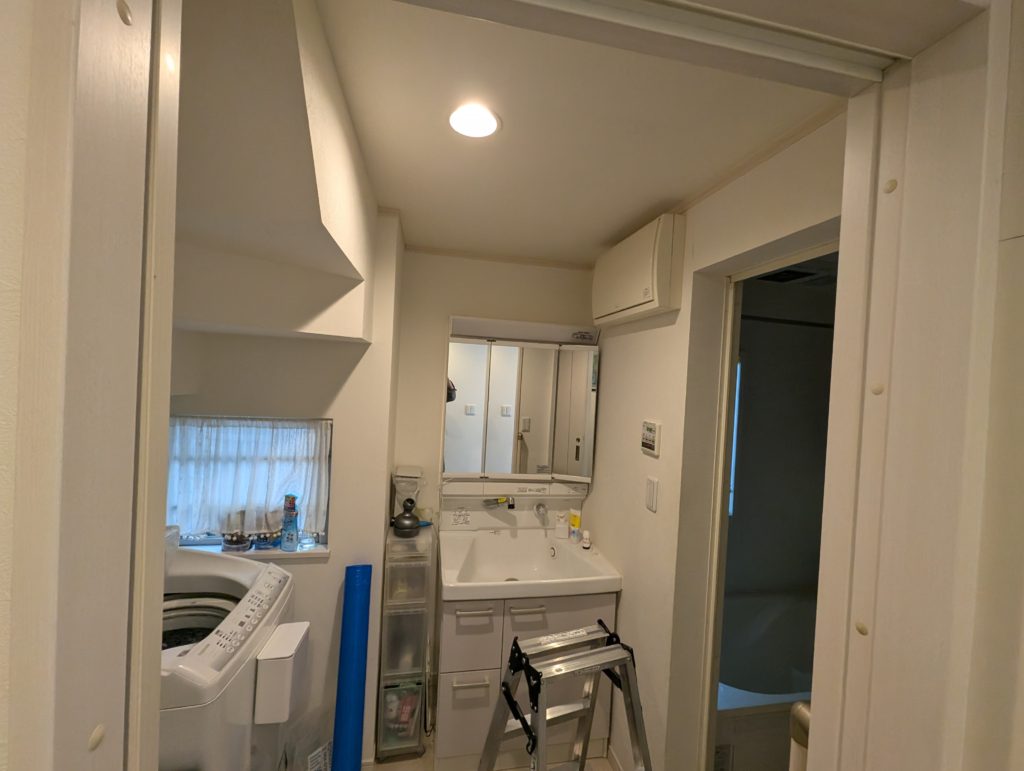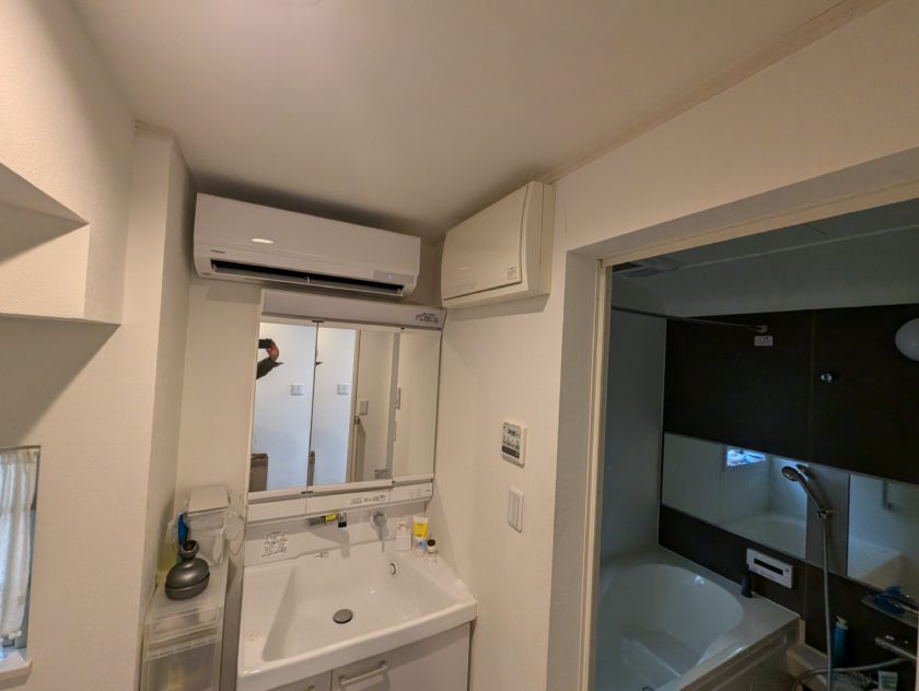 昨年末のお話ですが、お客様から洗面所が寒い!そして夏も熱い!何とかならない?とお問い合わせをいただきました。浴室暖房乾燥機を設置、洗面所は床暖房を導入というのが一般的な寒さ対策リフォームかと思いますが、それだと費用もかかるし、夏場の暑さ対策が出来ない・・・それじゃエアコンをつけちゃいましょう!ということで壁掛けエアコン設置しました。